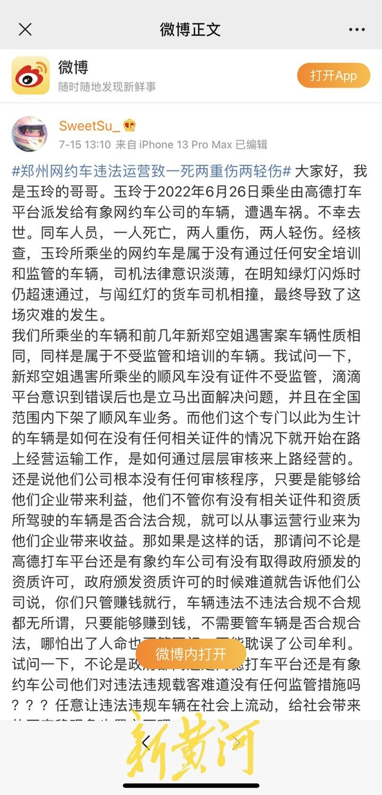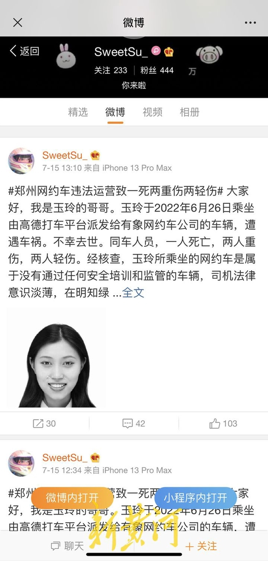 郑州女大学生苏玉玲发的最后一条微博停留在了6月25日的16:26,发这条信息时她还和朋友们开心地在一起。谁也没想到,6月26日,她和朋友在郑州乘坐由高德打车平台派发给“有象约车”的网约车时遭遇车祸,不幸去世,同车人员还有两人重伤,两人轻伤。