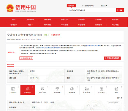 甬海市监处罚﹝2022﹞155号显示,经查明:2021年10月10日,宁波太平鸟电子商务有限公司在淘宝平台的太平鸟官方旗舰店上架销售了一款皮草马甲,宣传的主页面标有:“轻奢派”太平鸟皮草马甲外套女2021冬季新款真狐狸毛年轻皮草。