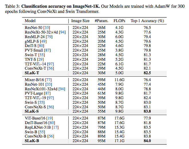 (4)根据这个 recipe,我构造了一个新型网络结构 Sparse Large Kernel Network,简称 SLaK。SLaK 搭载着有史以来最大的 51x51 卷积核,能够在相似的参数量和 FLOPs 的条件下,获得比最新先进的 ConvNeXt,Swin Transformer 和 RepLKNet 更好的性能。