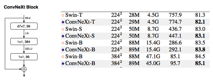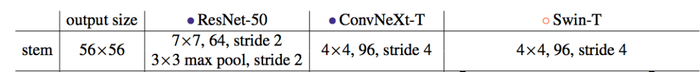 如果仔细分析 ConvNeXt 模型的特点,51x51 和 61x61 卷积核带来的精度下降是可以理解的。如下图所示,现阶段最先进的模型的 stem cell 都不约而同的采用了 stride=4 的结构将输入图片的分辨率缩减到了原来的 1/4。那么对经典的 224x224 iamgenet 来说,通过 stem cell 之后,feature 的大小就只有 56x56 了。所有 51x51 和 61x61 规模的卷积核就已经是全局水平的卷积核。一种合某些理想的特性,比如有效的局部特性。同样的现象我在 ViTs 的类似机制中也观察到过,即局部注意力通常优于全局注意力。在此基础上,我想到了通过引入局部性来解决这个问题的机会。
