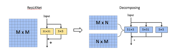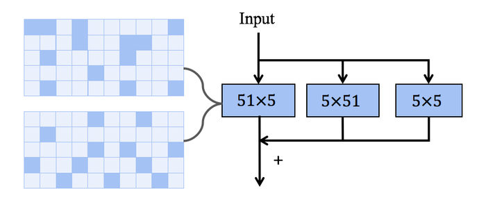 这里我采用的方法是将一个常用的 MxM 方形卷积核分解为两个平行的 MxN+NxM 长方形卷积核。如下图最右边所示。这里经验性的设置 N=5。