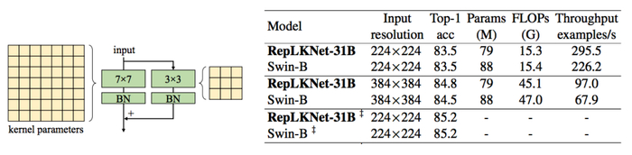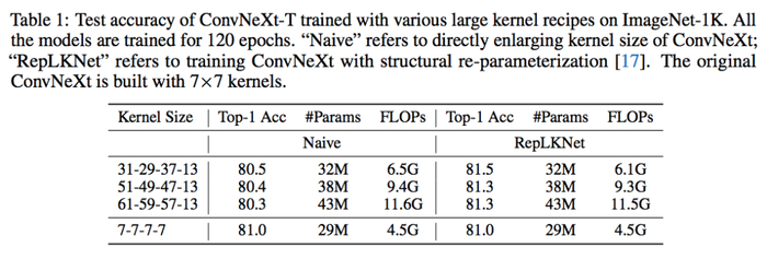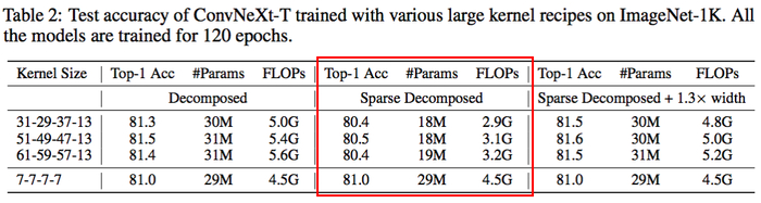 现有的大卷积核技术主要有两个,一是直接暴力 scale up 卷积核的 ConvNeXt,二是增加一个额外的小卷积层来辅助大卷积的训练,训练完成之后再用结构化再参数将小卷积核融入大卷积核里,即 RepLKNet。我分别测试了这两种方法在极致大卷积上的表现,如下表所示: