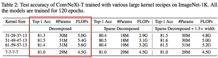 本文主要想探究的问题是:是否可以通过采用极致大卷积核(超过 31x31)来进一步提高 CNNs 的表现?为了回答这个问题,我在最近大火的 ConvNeXt 上对大卷积进行了系统的研究。我采用了和 ConvNeXt 一模一样的训练设定和超参并将卷积核放大到 31x31,51x51 和 61x61。受限于计算资源,我这里将模型训练到 120 个 epoch,仅仅用来观察卷积增大的趋势,得到了如下 3 个主要结论。