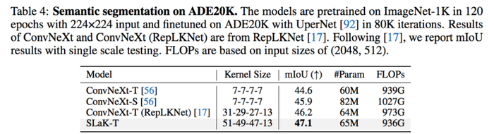 原始 ConvNeXt 采用的是 7x7 卷积核,ImageNet 上能达到 81.0% 的 top1 精度。但是当卷积逐渐增大的时候,ConvNeXt 出现了明显的掉点。相比之下,RepLKNet 成功的把卷积核增大到 31x31 并带来了超过 0.5 个点的可观提升。但是当卷积核增大到 51x51 甚至是 61x61 的时候,RepLKNet 也逐渐乏力。尤其是在 61x61 上,RepLKNet 的 FLOPs 增加了两倍,精度却反而降低了 0.2%。