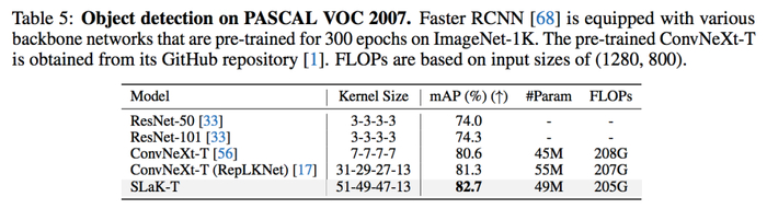 我利用上面发现的 recipe 在 ConvNeXt 上直接加载了 51x51 的卷积核,得到了 SLaK-T/S/B 模型。在不改变任何 ConvNeXt 原有的训练设置和超参的情况下,SLaK 在 ImageNet-1K 分类数据集,ADE20K 分割数据集、PASCAL VOC 2007 检测数据集,都超过了 Swin Transformer,ConvNeXt,和 RepLKNet 的表现。实验结果突出了极致卷积核在下游视觉任务中的关键作用。