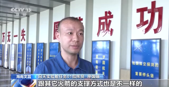 问天实验舱任务01指挥员 廖国瑞:长五火箭(B)的吊装和其他火箭吊装的方式不一样,而且我们长五火箭(B)和其他火箭的支撑方式也是不一样的,就是我们的四个助推然后支撑我们的芯一级,相当于是一个“抬轿子”的模式。因为长五火箭(B)它的直径比较大,芯一级的直径有五米,在整个吊装过程中,在受限空间操作,完成这么大直径的火箭的吊装,需要我们的精细操作、精心指挥,才能完成复杂的吊装任务。