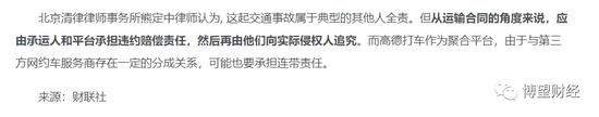 在高德打车和有象约车的声明中,都提到了交警判责——大货车司机全责,但是不容忽视的一点是受害人是通过高德打到的车,在此前财联社报道中,北京清律律师事务所熊定中律师认为, 这起交通事故属于典型的其他人全责。但从运输合同的角度来说,应由承运人和平台承担违约赔偿责任,然后再由他们向实际侵权人追究。而高德打车作为聚合平台,由于与第三方网约车服务商存在一定的分成关系,可能也要承担连带责任。