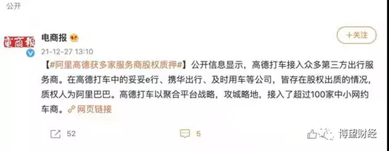 例如,包括携华出行、及时出行、妥妥E行在内的高德核心服务商都有股权出质给阿里巴巴。据天眼查公开信息显示,接入高德打车的第三方服务商中,有近10家存在向高德或阿里质押股权的情况。