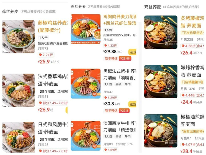 不论是声量大的轻食连锁品牌,还是单个直营店,各种口味的“鸡丝荞麦面”成为了这些品牌们,打开中式轻食赛道的敲门砖。