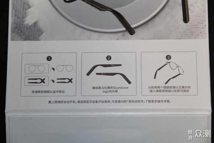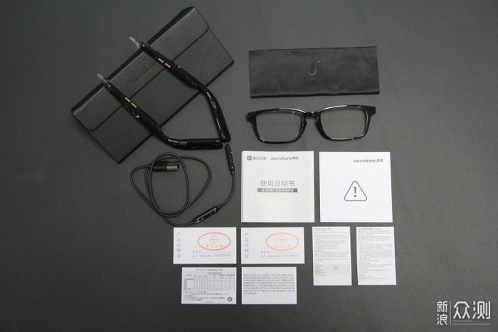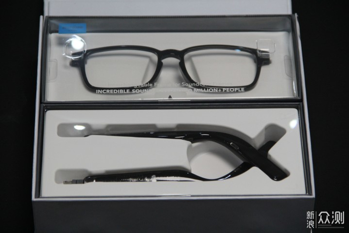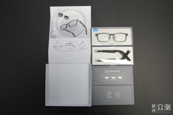 声阔智能眼镜采用了正方形的白色纸盒包装,正中间的4个大字“智能眼镜”就代表了这款产品的智能的身份,上方是喜马拉雅APP和声阔的联名品牌,背面则是产品的一些型号功能和配件的介绍,在打开它之前,开口处有一个银色的防伪贴,揭开以后会出现英文“OPEN VIOD",来证明这款眼镜包装已经被打开了,这款包装盒采用了颇有仪式感的磁吸式开盒,将包装盒打开后,映入眼帘的是镜框和镜腿两部分的硬件,分别放在两个不同的包装盒里,而两个硬件盒的下面还有两个盒子,分别是眼镜盒和使用说明书,还有磁吸充电线。整个的开箱里面就是镜框,镜腿,磁吸充电线,说明书,眼镜盒,眼镜布,保修卡,合格证等。