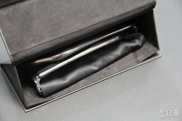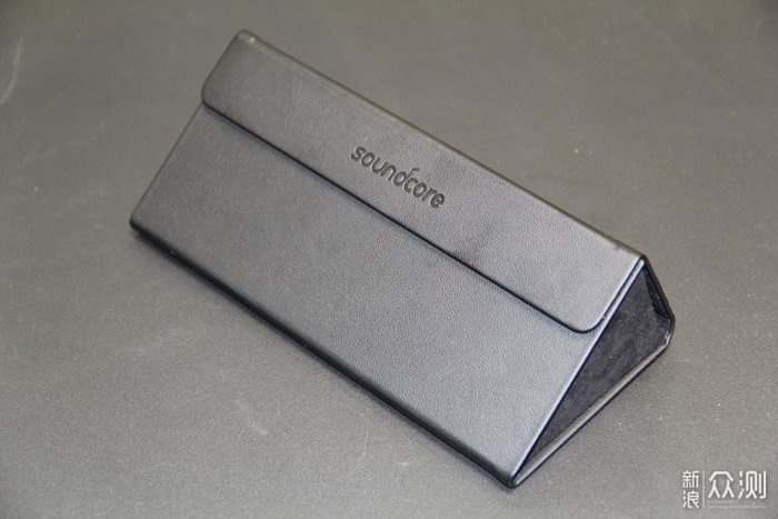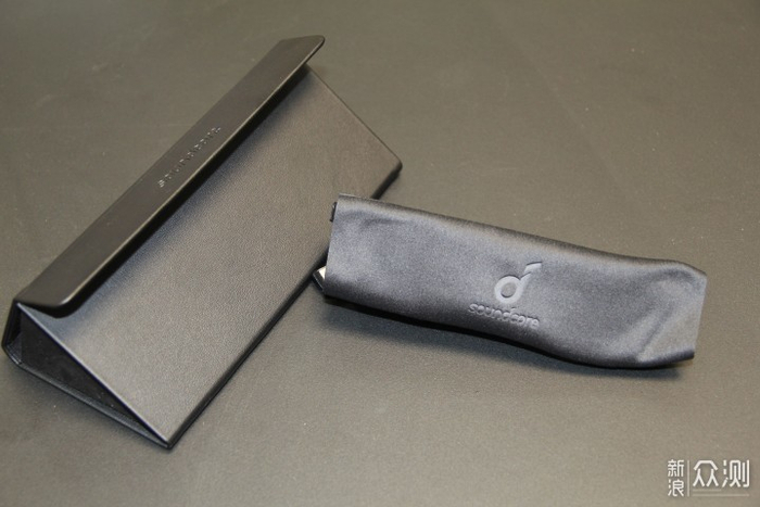 声阔智能眼镜的眼镜盒使用了黑色皮革的材质,触感细腻,表面印有声阔的英文商标,没装眼镜时还可以折叠起来,节省空间。
