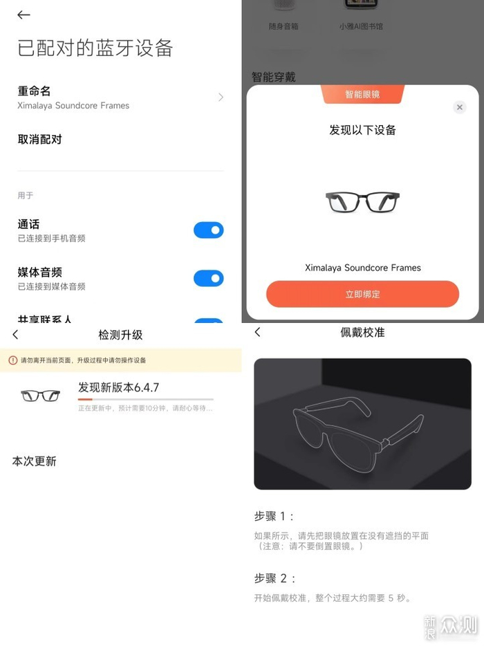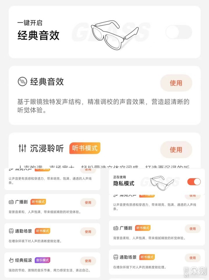 声阔智能眼镜可以不连接任何软件,当普通的蓝牙耳机使用,而为了更好的发挥这款智能眼镜的功效,可以通过绑定喜马拉雅APP使这款眼镜有进一步的音质表现力,当你和喜马拉雅APP绑定以后,会赠送你三个月的喜马拉雅会员,而且还可以在喜马拉雅APP上对耳机的音效进行调节,挑选你认为最适合你的音效和使用场景,在开启这些音效和使用场景的时候,我觉得使用这款眼镜自带的开放式环绕音会使耳机的音质有一个质的飞跃,增加了这款耳机音质的临场感,还可以使用喜马拉雅APP对声阔智能眼镜进行无线升级,当然这款智能眼镜因为采用的是开放式的播放场景,所以声音不能开的太大,否则在你使用这款智能眼镜上班摸鱼时,被老板发现,那么事情可就大条了。