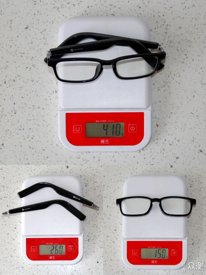 声阔智能眼镜实测重量跟官方数据一样,镜腿26克,镜框15克,总共41克,当然这个重量相较于传统眼镜会稍微的重了一点,但是和太阳墨镜相比,其实重量差不多,所以在佩戴上感觉不会太突兀。