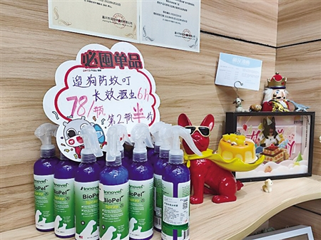 “狗狗等宠物,夏天特别要注意补水。”温老板宠物俱乐部店员称。记者在店内看到标有“营养补水、促进消化”的乳酸菌、萌宠玻尿酸电解质水、夏日驱虫喷雾等。