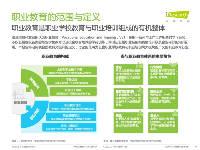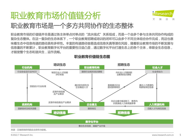 《2022年全球职业教育行业发展报告》职业教育是职业学校教育与职业培训组成的有机整体,行业参与者除教育培训机构与受训学生外,还涉及企业雇主、行业协会、政府等多方,各群体共同构成密不可分的产业生态。