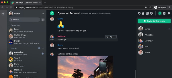 Matrix是由英国The Matrix.org Foundation在2014年发布的开放标准,它是个通过IP执行通讯的去中心化通讯协议,可应用在即时通讯、VoIP/WebRTC与物联网通讯上,目标是让用户的通讯就像寄送电子邮件一般容易,就算使用不同的服务也能彼此通讯。迄今支持Matrix的客户端应用包括Element、Fractal、Nheko、Quaternion,以及专为macOS设计的Seaglass,其中最受欢迎的是由Matrix共同创办人Matthew Hodgson所打造的Element。