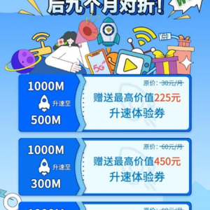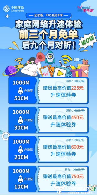 为了助力魔都小伙伴便捷升级千兆宽带,上海移动面向多档位宽带用户均提供前3个月免单升速、后9个月5折升速的超大优惠。以300M升1000M为例,原价60元每月的升速包,使用升速优惠后,用户每年花270元就能一步到位升级为千兆宽带。