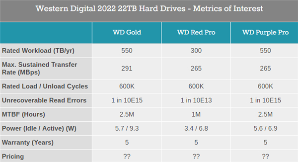 WD Purple Pro紫盘系列容量8-22TB,其中22TB数据传输率降至265MB/s,空闲和工作功耗降至5.6W、6.9W,其他和金盘相同。