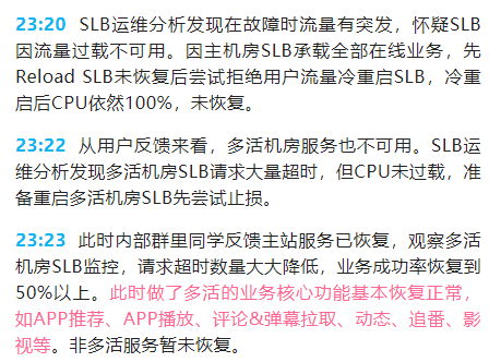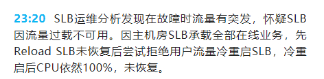 而在绿色通道成功打通,负责各种业务的团队就位之后,B站也开始对问题进行分析定位。出问题的模块也很明显,在线业务主机房的7层SLB(负载均衡服务器,用来处理多用户,多业务的情况)的CPU跑满了100%。