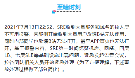咱也看了一下这篇文章,好家伙,让整个B站崩溃的原因,竟然只是一行代码没写好???借着这篇文章,世超准备带大家从 B站的角度来回顾一下这件事情。放心,不会有生涩难懂的名词,不会有犀利糊涂的黑话,保证小白也能看明白。 案情回溯: 意外,发生在2021年7月13日的22时52分。
