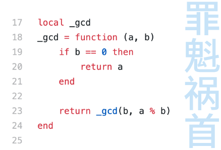 这是一个典型的“ 自己调用自己”的递归函数。ab两数字辗转求余,直到 b等于0 的时候函数终止。不然这个函数就会自己调用自己,重新再跑一遍。