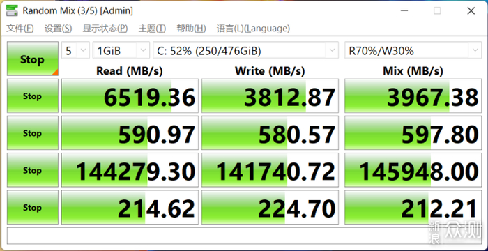 CrystalDiskMark实测读取6519.36MB/S,写入3812.87MB/S,读70%/写30%混合3967.38MB/s,超过标准参数,性能可以说释放完美。