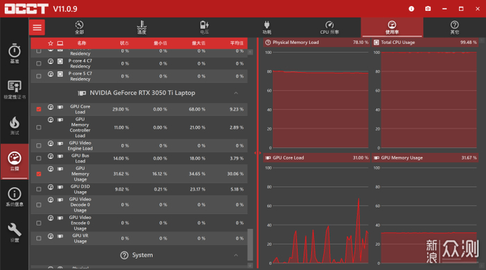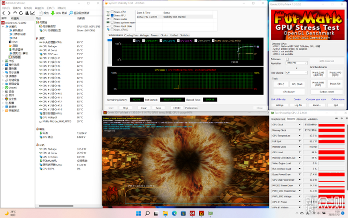 使用Stress FPU和Furmark双烤测试,CPU功耗33.53W,温度85℃,GPU功耗51.39W,温度80.9℃,整机功耗85W,性能释放不错,温度表现也在稳定范围内,同级别产品中属于较好的水平,华硕的对CPU/GPU以及散热的整合能力确实比较强。