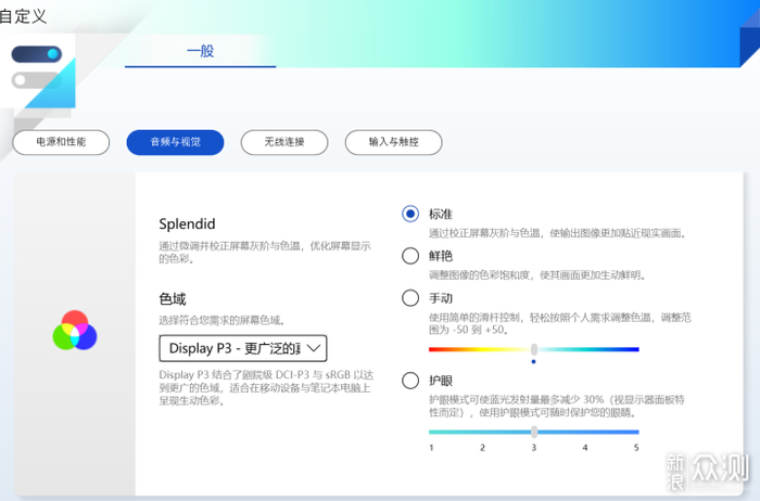色彩配置文件可以在MyASUS华硕管家中进行选择,提供了原生/sRGB/DCI-P3/Display P3四种色域选项,这里选择Display P3进行测试。