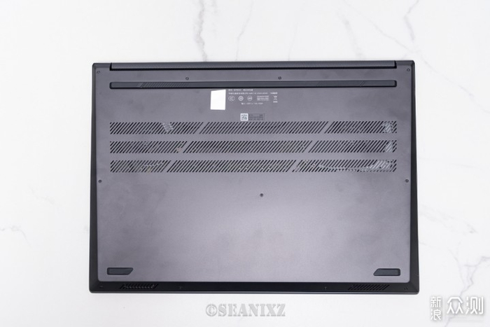 D面也是金属材质,可以看到大面积的散热孔,透过散热孔可以直接看到两个散热风扇,对于i7-12700H这样的顶配U来说,散热是比较重要的,下文会拆机烤机详细评测。