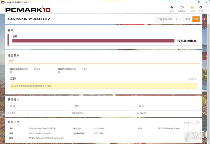 移除适配器,设置标准模式,屏幕亮度75%,使用PCMARK10电池性能测试中的视频性能来测试了一下续航表现。
