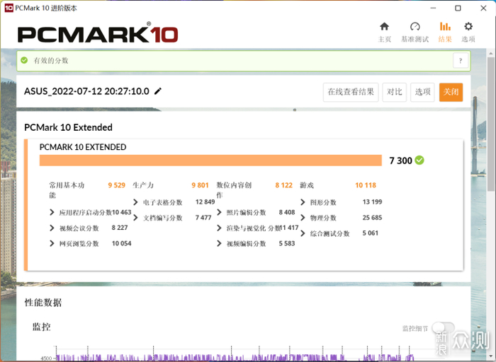 PCMark10Extended测试分数为7300分,常用基本功能9529分,生产力9801分,数为内容创作8122分,尤其在渲染与视觉化两项中与CPU相关的分数达到了一万以上,12代i7-12700H处理器确实有较强的创作类软件处理加成。