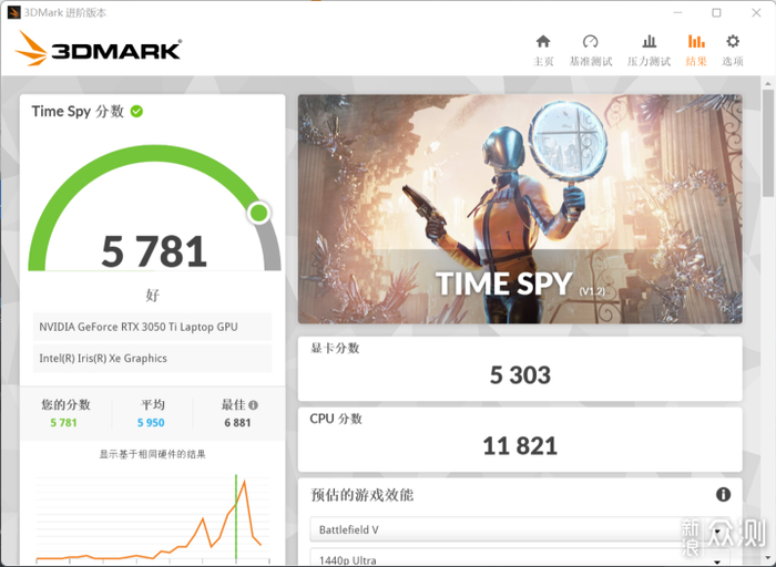 在3DMARK基准测试Time Spy中跑分为5781分,作为轻薄本来说分数还不错。