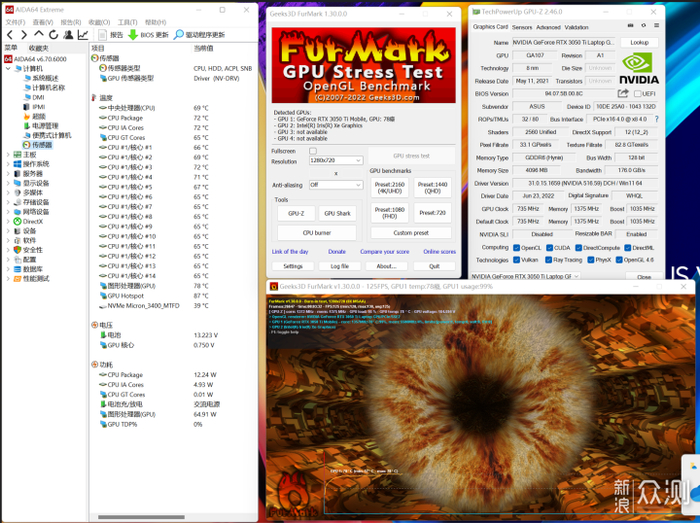 Furmark甜甜圈单烤显卡,功耗稳定在65W左右,温度78℃ 在使用3050ti的轻薄本中性能释放也算较好的水平。