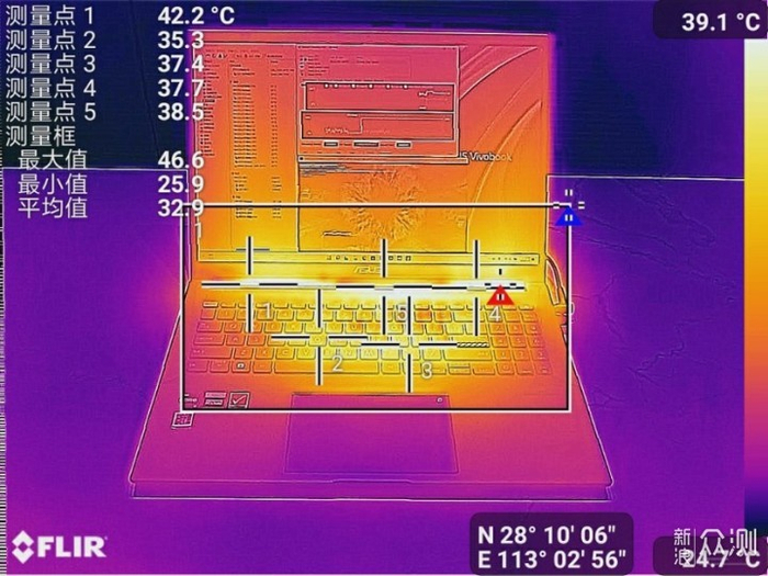 双烤30分钟使用红外热成像记录了一下机身表面温度,最大值在右上角出风口,温度46.6℃,键盘区域较热的部分在35-37℃之间,环境温度25℃的条件下满载不会有键盘烫手的问题,有较好的日常使用体验。