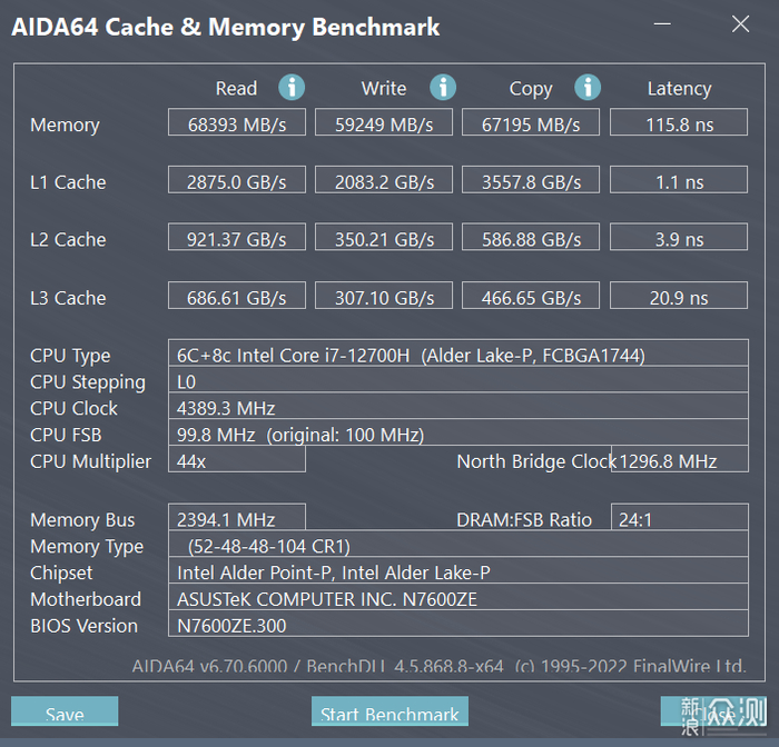 使用AIDA64的内存测试工具测试,读取69393MB/s,写入59249MB/s,速度还不错,高速内存对于生产力软件的提升是比较大的,为设计创作类工况服务。