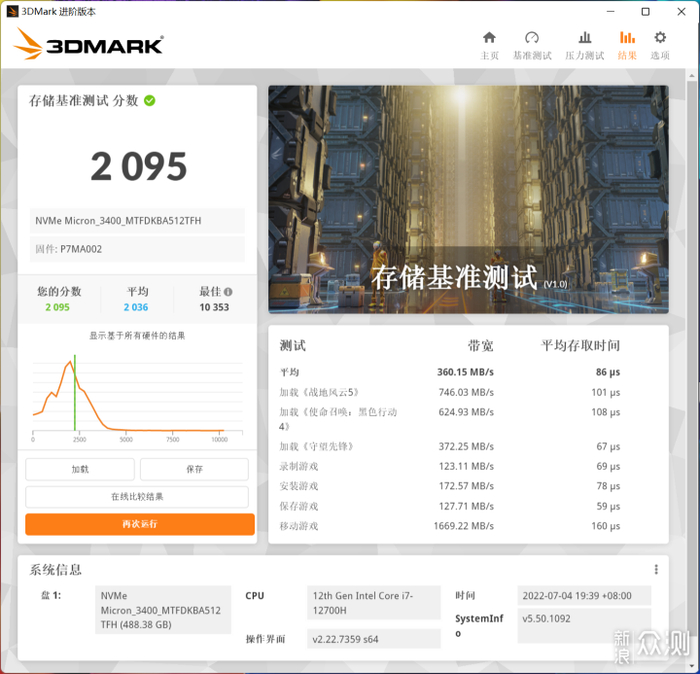 3DMARK存储基准测试跑分2095分,高于同款平均值。
