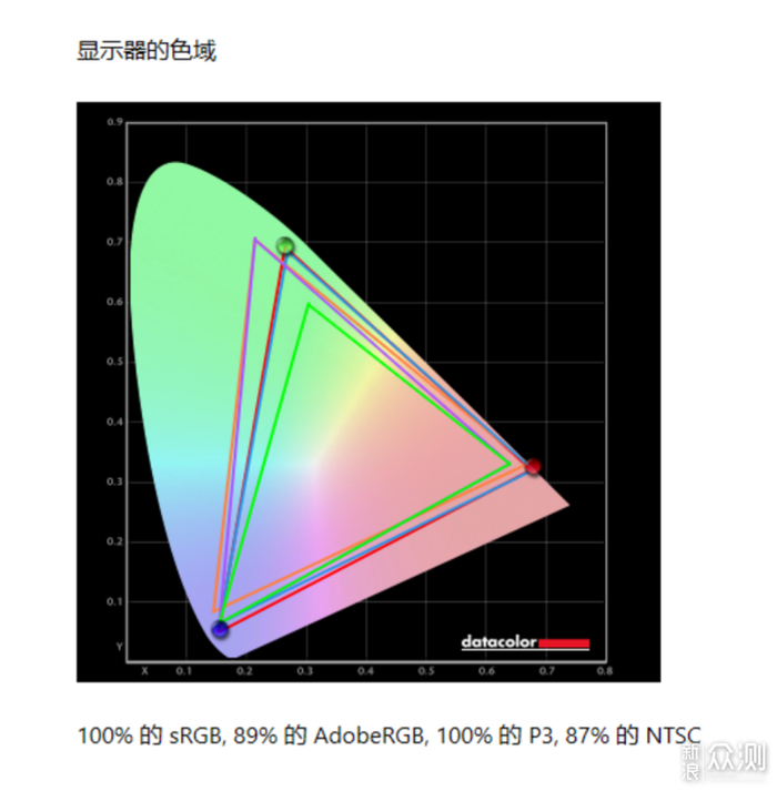 色域为100%的sRGB,89%的AdobeRGB,100%的P3,87%的NTSC,实测100%覆盖P3色域,有较好的色彩展现力。