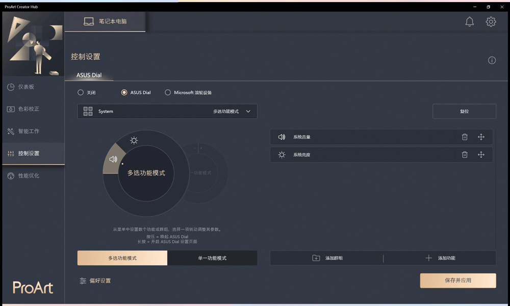 华硕虚拟旋钮也不例外,功能可以在自带的创作者中心(ProArt Creator Hub)中进行功能增减与设置。