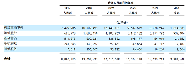 财报显示,陌陌目前的收入来自视频直播服务、增值服务、移动营销服务、手机游戏和其他服务。其中,视频直播服务包括虚拟礼物打赏,这部分业务在陌陌营收中占了重要位置, 2019~2021年其净收入占比分别为64.1%、57.5%和73.2%。增值服务指会员订阅和虚拟礼物销售,同期内净收入占比为24.1%、34.0%和41.0%。