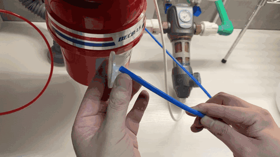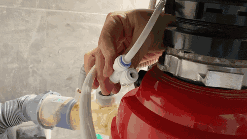 三通一共三个出水口,上面说过是2分管,首先把饮水机污水管、前置净水机污水管并到一起,然后再切下一段污水管插到第三个头上,用卡子卡好。这种水管接口,需要把蓝色的那个地方往下按,才能拔出水管,插的时候,直接往里插就可以了,水管插到位,卡上卡子,污水管路安装完成。