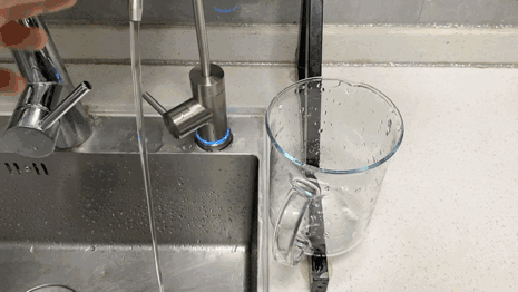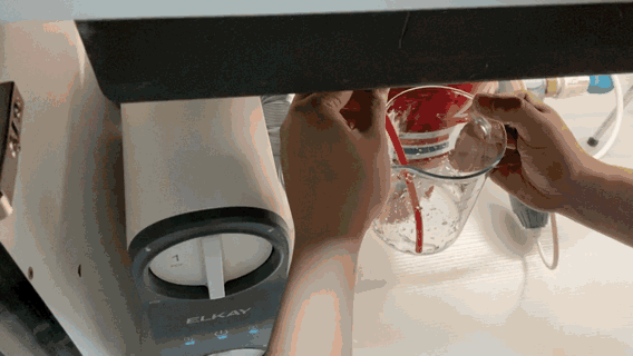 纯废比实验,上面打开纯净水龙头,下面接住废水。根据厂家提供的净水效能为一级,产水率大于67.6%。