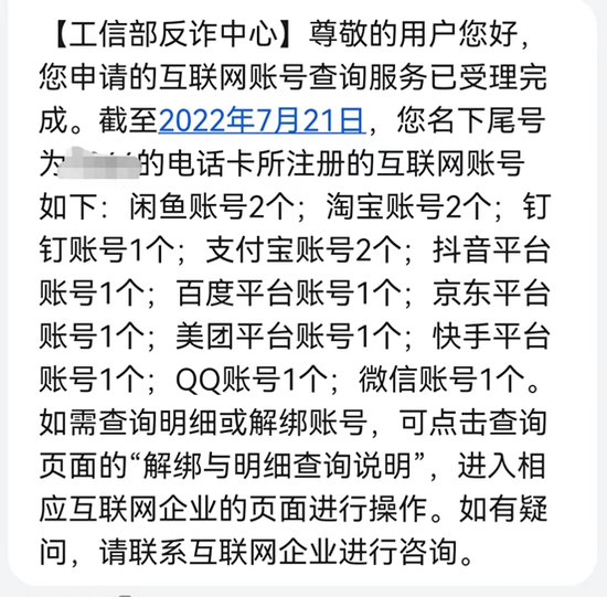 当用户查询到本人手机号码关联的互联网账号数量,与个人掌握的情况不一致时,可按照下面步骤解决: