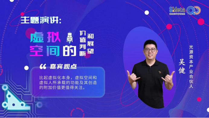 光源资本产业合伙人吴健认为,元宇宙本质上是人类社会的一个未来社会形态。随着科技和互联网的不断发展和演进,快速扩张的数字世界必然会和物质世界深度交织,实现虚实结合,人类社会的主要消费和生产环节都将面临这一变化。吴健在分享中表示,虚拟空间和虚拟人是载体,而非结果,技术的发展推动产品和内容迭代,产品和内容服务于人类的需求,因此在虚拟化的同时,更要关注虚拟空间和虚拟人所承载的功能,以及其创造出的附加价值。