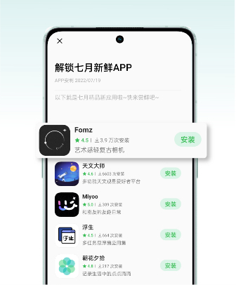 新版【应用时刻】栏目加强了应用核心信息的外显,帮助应用更直接地触达用户。卡片图采用 icon 大图、多 icon 动图,增强用户感知;子栏目【今日 APP】将资源类型与安装按钮直接展示在卡片外部,便于用户一键下载使用。