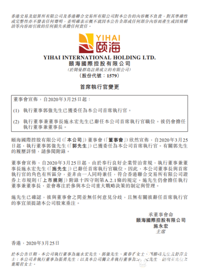 2020年3月颐海国际(01579)发布公告,执行董事郭强已获委任为公司首席执行官。执行董事兼董事长施永宏已辞任公司首席执行官职位。彼仍会担任执行董事兼董事长。