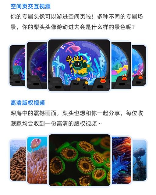 “亿点点不一样”在B站拥有超180万粉丝,由B站百大UP主“影视飓风”团队运营,用高清镜头从不一样的视角为观众展示科学现象。最新一期视频中,UP主带观众走进神秘的海底世界,探索珊瑚背后的奥秘。为纪念这期节目,本次数字藏品以海洋探秘为主题,主角亿点点小人“梨头”化身为潜水员、水手、探险家、神话人物等角色,以数字头像形式发放给收藏用户,还可融入随藏品附赠的空间页交互视频,在视频中游动起来,将用户的B站个人空间变为海底世界,充满乐趣。