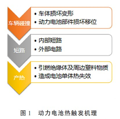 车辆在发生碰撞时,如果撞到电池,导致电池箱变形或破裂,进而导致电池组线柱错位,引发外部短路。在脱离防护切断电流的状况下,外部短路产生的强电流引起电池急剧升温,最后导致电池燃烧。