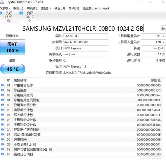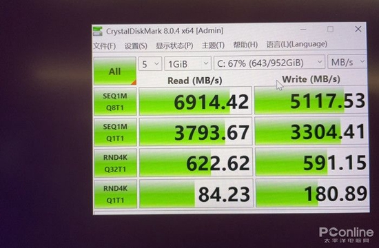 硬盘使用了三星的“PM98A1”PCIE4.0固态硬盘,是980Pro的OEM版本,TLC闪存,读写速度属于PCIE4.0硬盘中第一梯队。