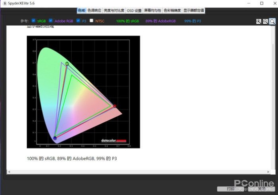 使用SpyderEliteX校色仪检测其性能,可覆盖100%sRGB色域和99%P3色域,最大亮度达500尼特,平均△E色准为0.89,屏幕素质不错。