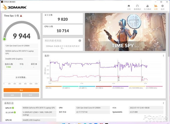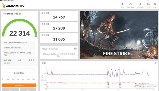FireStrike显卡分数达到24769分,约为150W满功耗版RTX3070Ti的81%性能。TimeSpy模式显卡分为9820分。